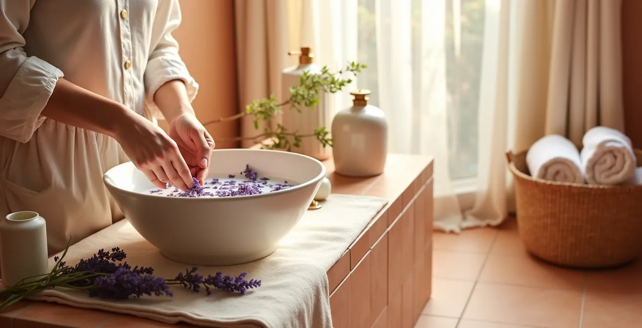 La idea de un spa en casa no es nueva, pero a menudo se queda en la anécdota de encender un par de velas. ¿Y si te dijera que tu ritual de domingo puede ser una potente intervención bioquímica? La clave no está solo en relajarse, sino en entender por qué cada gesto funciona. Se trata de utilizar el poder del agua, los aromas y el tacto para enviar una señal clara a tu sistema nervioso: es hora de pasar del modo «lucha o huida» al modo «reparación y descanso». Este es el secreto para calmar la inflamación interna y permitir que tu piel inicie su proceso natural de regeneración.