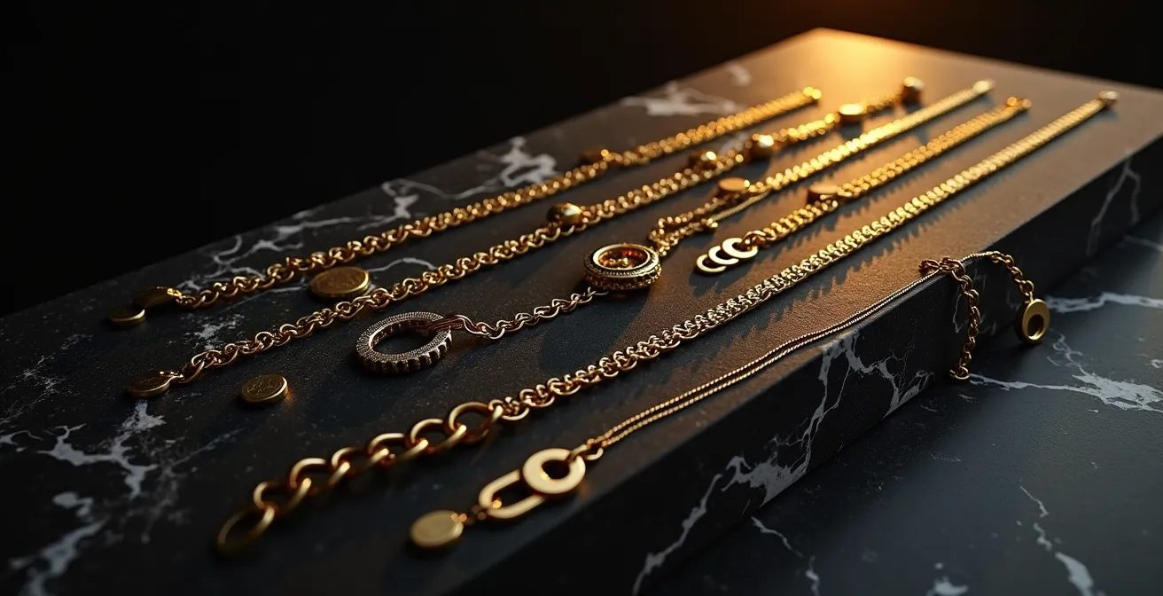 La segunda regla es alternar las texturas. Superponer tres cadenas cubanas del mismo grosor puede resultar pesado y monótono. El truco está en mezclar estilos. Combina una cadena de eslabones más planos y anchos (como una Fígaro o una cubana) con una de eslabones más redondeados y finos (como una Rope o una Franco). Esto no solo evita enredos, sino que crea un juego de luces y sombras mucho más interesante. Incluso puedes introducir un tercer elemento, como un collar de perlas o una cadena con un colgante sencillo, para romper la monotonía del metal.